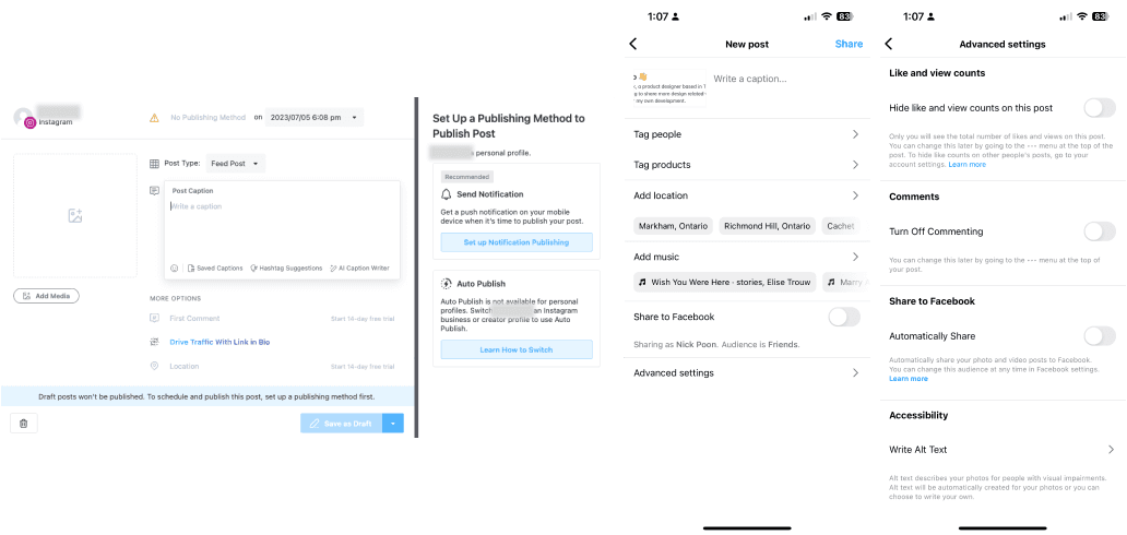 To better understand the scheduling post feature, I tested on Later, an already established social media scheduling tool and also Instagram’s new post advanced setting